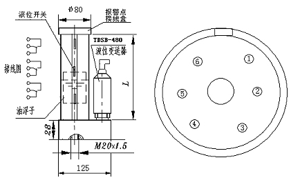 報(bào)警點(diǎn)接線盒:端子1、2為上限,液位高于上限時(shí)斷開,低于上限時(shí)閉合;端子3、4為中點(diǎn),液位高于中點(diǎn)時(shí)斷開,低于中點(diǎn)時(shí)閉合;端子56為下限,液位低于下限時(shí)閉合,高于下限時(shí)斷開。