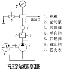 電動(dòng)機(jī)通過聯(lián)軸器直接帶動(dòng)齒輪泵泵油,壓力油經(jīng)過溢流閥調(diào)節(jié)通往單向閥到達(dá)四通集成塊,分別供給壓力表、調(diào)節(jié)截止閥和用油對象供油;
